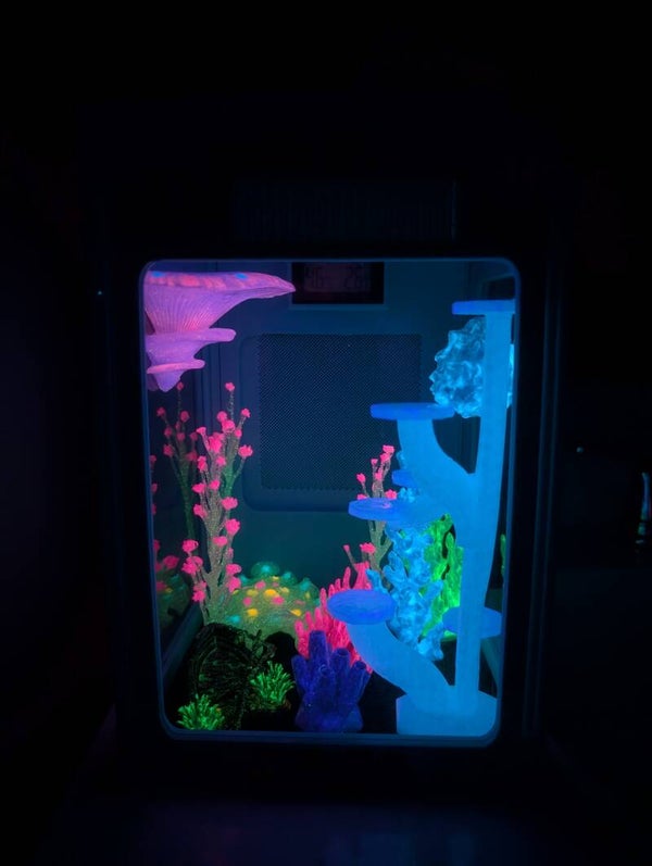 This complete enclosure set comes with everything you and your spood need to head out on an undersea adventure together. The enclosure comes with a Hygrometer/Thermometer, spood safe grass, Feeding Dish, Water Dish designed with your Spoods safety in mind, 1 Large Mushroom Step, 1 Seashell Hide, 4 Decorative Corals, 3 Decorative Seaweeds, a Sunken Ship, a Coral Hide and 1 Large Coral stand. This enclosure was designed to have a bioluminescent effect and is truly stunning when it glows!! As always, colors can be customized however you can imagine!